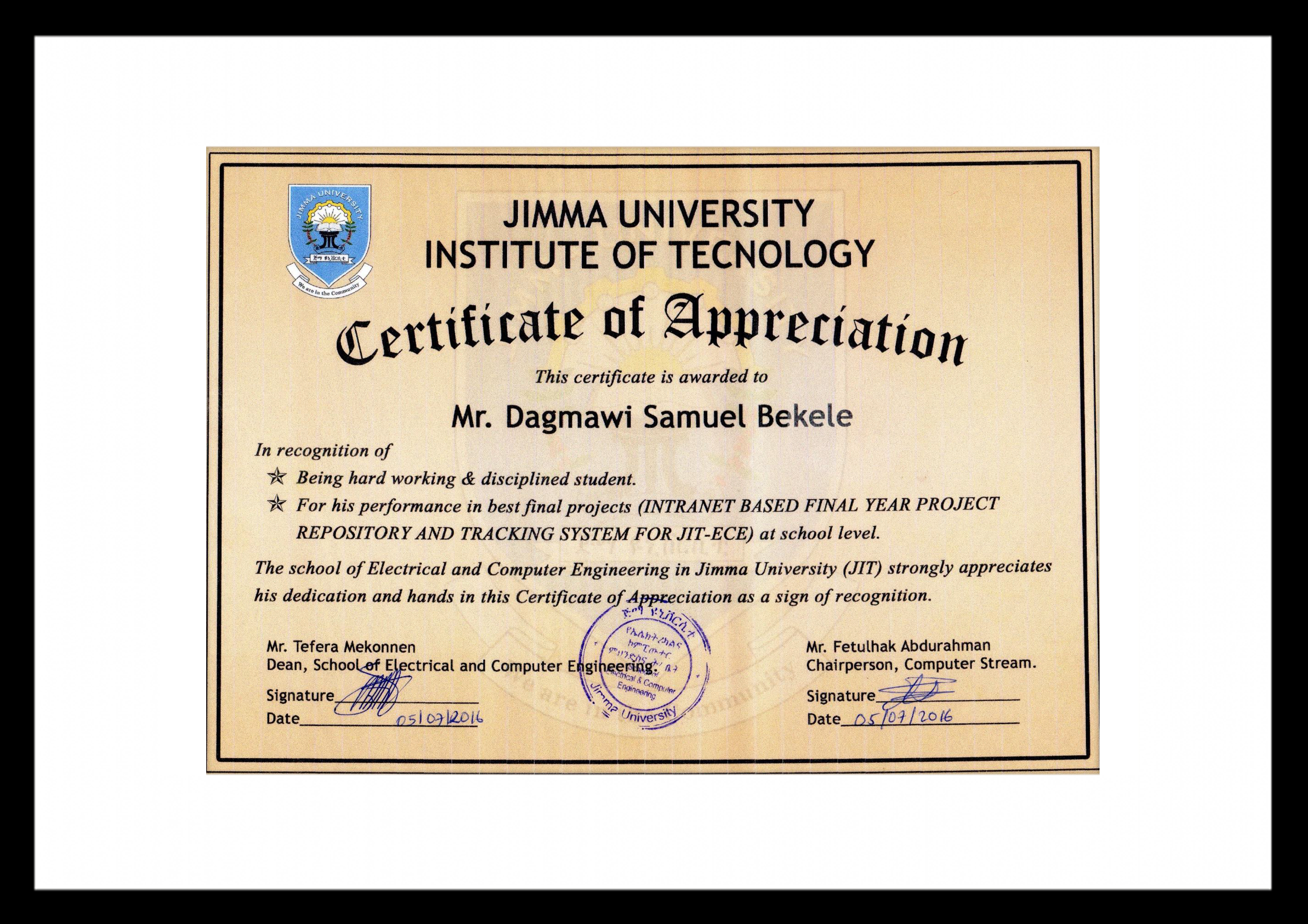- Outstanding final project (2016) - Developed an INTRANET-BASED FINAL YEAR PROJECT REPOSITORY AND TRACKING SYSTEM FOR JIT-ECE (Web Application).